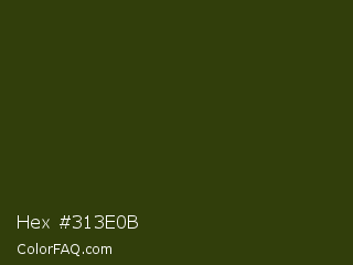 Hex #313e0b Color is a very dark lime color and the nearest color is Waiouru #363c0d. Hex code #313e0b and RGB value is rgb(49,62,11). In RGB color space, this color is composed of 19% red, 24% green, 4% blue, In CMYK color space, this color is composed of 21% cyan, 0% magenta, 82% yellow , 76% black , In HSL color space, this color has a hue angle of 75° , 70% saturation and 14% lightness.
