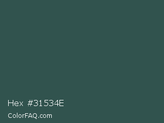 Hex #31534e Color is a dark cyan color and the nearest color is Dark Slate Gray #2f4f4f. Hex code #31534e and RGB value is rgb(49,83,78). In RGB color space, this color is composed of 19% red, 33% green, 31% blue, In CMYK color space, this color is composed of 41% cyan, 0% magenta, 6% yellow , 67% black , In HSL color space, this color has a hue angle of 171° , 26% saturation and 26% lightness.