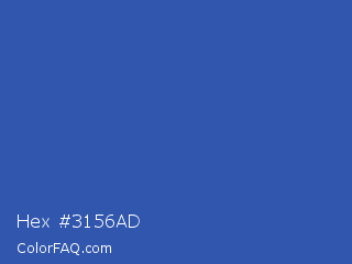 Hex #3156ad Color is a normal blue color and the nearest color is Azure #315ba1. Hex code #3156ad and RGB value is rgb(49,86,173). In RGB color space, this color is composed of 19% red, 34% green, 68% blue, In CMYK color space, this color is composed of 72% cyan, 50% magenta, 0% yellow , 32% black , In HSL color space, this color has a hue angle of 222° , 56% saturation and 44% lightness.