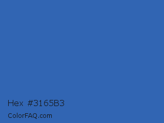 Hex #3165b3 Color is a normal blue color and the nearest color is Azure #315ba1. Hex code #3165b3 and RGB value is rgb(49,101,179). In RGB color space, this color is composed of 19% red, 40% green, 70% blue, In CMYK color space, this color is composed of 73% cyan, 44% magenta, 0% yellow , 30% black , In HSL color space, this color has a hue angle of 216° , 57% saturation and 45% lightness.