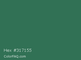 Hex #317155 Color is a normal green color and the nearest color is Amazon #3b7a57. Hex code #317155 and RGB value is rgb(49,113,85). In RGB color space, this color is composed of 19% red, 44% green, 33% blue, In CMYK color space, this color is composed of 57% cyan, 0% magenta, 25% yellow , 56% black , In HSL color space, this color has a hue angle of 154° , 40% saturation and 32% lightness.