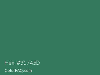 Hex #317a5d Color is a normal green color and the nearest color is Amazon #3b7a57. Hex code #317a5d and RGB value is rgb(49,122,93). In RGB color space, this color is composed of 19% red, 48% green, 36% blue, In CMYK color space, this color is composed of 60% cyan, 0% magenta, 24% yellow , 52% black , In HSL color space, this color has a hue angle of 156° , 43% saturation and 34% lightness.