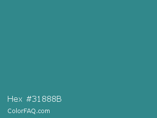 Hex #31888b Color is a normal cyan color and the nearest color is Lochinvar #2c8c84. Hex code #31888b and RGB value is rgb(49,136,139). In RGB color space, this color is composed of 19% red, 53% green, 55% blue, In CMYK color space, this color is composed of 65% cyan, 2% magenta, 0% yellow , 45% black , In HSL color space, this color has a hue angle of 182° , 48% saturation and 37% lightness.