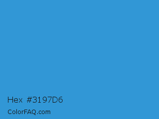Hex #3197d6 Color is a normal blue color and the nearest color is Curious Blue #2596d1. Hex code #3197d6 and RGB value is rgb(49,151,214). In RGB color space, this color is composed of 19% red, 59% green, 84% blue, In CMYK color space, this color is composed of 77% cyan, 29% magenta, 0% yellow , 16% black , In HSL color space, this color has a hue angle of 203° , 67% saturation and 52% lightness.