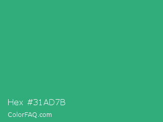 Hex #31ad7b Color is a normal green color and the nearest color is Jungle Green #29ab87. Hex code #31ad7b and RGB value is rgb(49,173,123). In RGB color space, this color is composed of 19% red, 68% green, 48% blue, In CMYK color space, this color is composed of 72% cyan, 0% magenta, 29% yellow , 32% black , In HSL color space, this color has a hue angle of 156° , 56% saturation and 44% lightness.