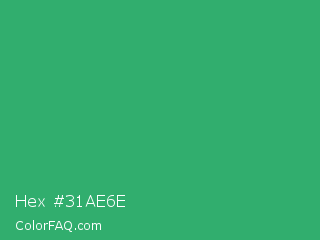 Hex #31ae6e Color is a normal green color and the nearest color is Medium Sea Green #3cb371. Hex code #31ae6e and RGB value is rgb(49,174,110). In RGB color space, this color is composed of 19% red, 68% green, 43% blue, In CMYK color space, this color is composed of 72% cyan, 0% magenta, 37% yellow , 32% black , In HSL color space, this color has a hue angle of 149° , 56% saturation and 44% lightness.