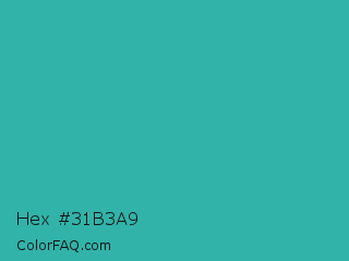 Hex #31b3a9 Color is a normal cyan color and the nearest color is Keppel #3ab09e. Hex code #31b3a9 and RGB value is rgb(49,179,169). In RGB color space, this color is composed of 19% red, 70% green, 66% blue, In CMYK color space, this color is composed of 73% cyan, 0% magenta, 6% yellow , 30% black , In HSL color space, this color has a hue angle of 175° , 57% saturation and 45% lightness.