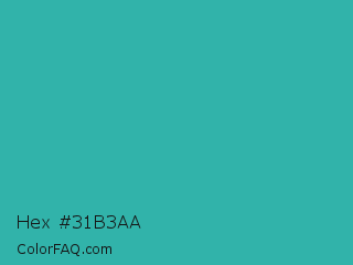 Hex #31b3aa Color is a normal cyan color and the nearest color is Keppel #3ab09e. Hex code #31b3aa and RGB value is rgb(49,179,170). In RGB color space, this color is composed of 19% red, 70% green, 67% blue, In CMYK color space, this color is composed of 73% cyan, 0% magenta, 5% yellow , 30% black , In HSL color space, this color has a hue angle of 176° , 57% saturation and 45% lightness.