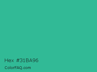 Hex #31ba96 Color is a normal cyan color and the nearest color is Mountain Meadow #30ba8f. Hex code #31ba96 and RGB value is rgb(49,186,150). In RGB color space, this color is composed of 19% red, 73% green, 59% blue, In CMYK color space, this color is composed of 74% cyan, 0% magenta, 19% yellow , 27% black , In HSL color space, this color has a hue angle of 164° , 58% saturation and 46% lightness.