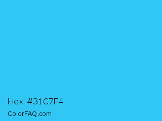 Hex #31c7f4 Color is a normal blue color and the nearest color is Picton Blue #45b1e8. Hex code #31c7f4 and RGB value is rgb(49,199,244). In RGB color space, this color is composed of 19% red, 78% green, 96% blue, In CMYK color space, this color is composed of 80% cyan, 18% magenta, 0% yellow , 4% black , In HSL color space, this color has a hue angle of 194° , 90% saturation and 57% lightness.