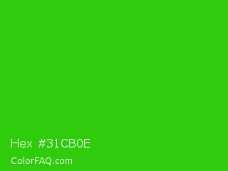 Hex #31cb0e Color is a normal green color and the nearest color is Harlequin Green #46cb18. Hex code #31cb0e and RGB value is rgb(49,203,14). In RGB color space, this color is composed of 19% red, 80% green, 5% blue, In CMYK color space, this color is composed of 76% cyan, 0% magenta, 93% yellow , 20% black , In HSL color space, this color has a hue angle of 109° , 87% saturation and 43% lightness.