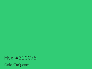 Hex #31cc75 Color is a normal green color and the nearest color is UFO Green #3cd070. Hex code #31cc75 and RGB value is rgb(49,204,117). In RGB color space, this color is composed of 19% red, 80% green, 46% blue, In CMYK color space, this color is composed of 76% cyan, 0% magenta, 43% yellow , 20% black , In HSL color space, this color has a hue angle of 146° , 61% saturation and 50% lightness.