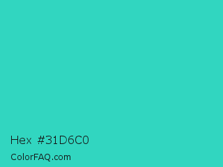 Hex #31d6c0 Color is a normal cyan color and the nearest color is Turquoise PWG #30d5c8. Hex code #31d6c0 and RGB value is rgb(49,214,192). In RGB color space, this color is composed of 19% red, 84% green, 75% blue, In CMYK color space, this color is composed of 77% cyan, 0% magenta, 10% yellow , 16% black , In HSL color space, this color has a hue angle of 172° , 67% saturation and 52% lightness.
