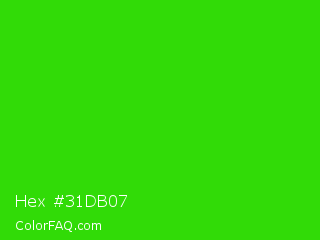 Hex #31db07 Color is a normal green color and the nearest color is Harlequin Green #46cb18. Hex code #31db07 and RGB value is rgb(49,219,7). In RGB color space, this color is composed of 19% red, 86% green, 3% blue, In CMYK color space, this color is composed of 78% cyan, 0% magenta, 97% yellow , 14% black , In HSL color space, this color has a hue angle of 108° , 94% saturation and 44% lightness.