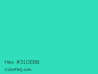 Hex #31debb Color is a normal cyan color and the nearest color is Turquoise PWG #30d5c8. Hex code #31debb and RGB value is rgb(49,222,187). In RGB color space, this color is composed of 19% red, 87% green, 73% blue, In CMYK color space, this color is composed of 78% cyan, 0% magenta, 16% yellow , 13% black , In HSL color space, this color has a hue angle of 168° , 72% saturation and 53% lightness.