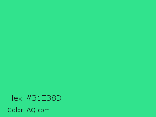Hex #31e38d Color is a normal green color and the nearest color is Shamrock #33cc99. Hex code #31e38d and RGB value is rgb(49,227,141). In RGB color space, this color is composed of 19% red, 89% green, 55% blue, In CMYK color space, this color is composed of 78% cyan, 0% magenta, 38% yellow , 11% black , In HSL color space, this color has a hue angle of 151° , 76% saturation and 54% lightness.