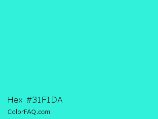 Hex #31f1da Color is a normal cyan color and the nearest color is Turquoise #40e0d0. Hex code #31f1da and RGB value is rgb(49,241,218). In RGB color space, this color is composed of 19% red, 95% green, 85% blue, In CMYK color space, this color is composed of 80% cyan, 0% magenta, 10% yellow , 5% black , In HSL color space, this color has a hue angle of 173° , 87% saturation and 57% lightness.