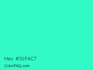 Hex #31fac7 Color is a normal cyan color and the nearest color is Turquoise #40e0d0. Hex code #31fac7 and RGB value is rgb(49,250,199). In RGB color space, this color is composed of 19% red, 98% green, 78% blue, In CMYK color space, this color is composed of 80% cyan, 0% magenta, 20% yellow , 2% black , In HSL color space, this color has a hue angle of 165° , 95% saturation and 59% lightness.