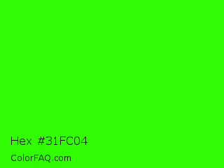 Hex #31fc04 Color is a normal green color and the nearest color is Harlequin #3fff00. Hex code #31fc04 and RGB value is rgb(49,252,4). In RGB color space, this color is composed of 19% red, 99% green, 2% blue, In CMYK color space, this color is composed of 81% cyan, 0% magenta, 98% yellow , 1% black , In HSL color space, this color has a hue angle of 109° , 98% saturation and 50% lightness.