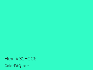 Hex #31fcc6 Color is a normal cyan color and the nearest color is Turquoise #40e0d0. Hex code #31fcc6 and RGB value is rgb(49,252,198). In RGB color space, this color is composed of 19% red, 99% green, 78% blue, In CMYK color space, this color is composed of 81% cyan, 0% magenta, 21% yellow , 1% black , In HSL color space, this color has a hue angle of 164° , 97% saturation and 59% lightness.