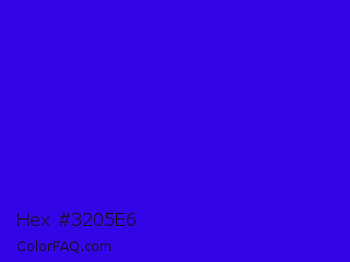 Hex #3205e6 Color is a normal indigo color and the nearest color is Interdimensional Blue #360ccc. Hex code #3205e6 and RGB value is rgb(50,5,230). In RGB color space, this color is composed of 20% red, 2% green, 90% blue, In CMYK color space, this color is composed of 78% cyan, 98% magenta, 0% yellow , 10% black , In HSL color space, this color has a hue angle of 252° , 96% saturation and 46% lightness.