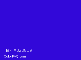 Hex #3208d9 Color is a normal indigo color and the nearest color is Interdimensional Blue #360ccc. Hex code #3208d9 and RGB value is rgb(50,8,217). In RGB color space, this color is composed of 20% red, 3% green, 85% blue, In CMYK color space, this color is composed of 77% cyan, 96% magenta, 0% yellow , 15% black , In HSL color space, this color has a hue angle of 252° , 93% saturation and 44% lightness.