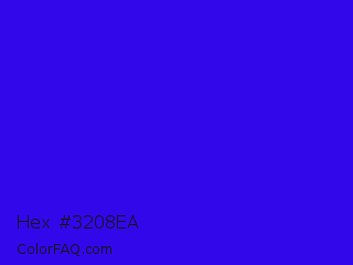 Hex #3208ea Color is a normal indigo color and the nearest color is Electric Ultramarine #3f00ff. Hex code #3208ea and RGB value is rgb(50,8,234). In RGB color space, this color is composed of 20% red, 3% green, 92% blue, In CMYK color space, this color is composed of 79% cyan, 97% magenta, 0% yellow , 8% black , In HSL color space, this color has a hue angle of 251° , 93% saturation and 47% lightness.