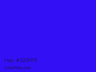 Hex #320ff5 Color is a normal indigo color and the nearest color is Electric Ultramarine #3f00ff. Hex code #320ff5 and RGB value is rgb(50,15,245). In RGB color space, this color is composed of 20% red, 6% green, 96% blue, In CMYK color space, this color is composed of 80% cyan, 94% magenta, 0% yellow , 4% black , In HSL color space, this color has a hue angle of 249° , 92% saturation and 51% lightness.