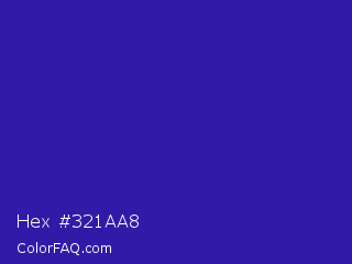 Hex #321aa8 Color is a normal indigo color and the nearest color is Blue Pigment #333399. Hex code #321aa8 and RGB value is rgb(50,26,168). In RGB color space, this color is composed of 20% red, 10% green, 66% blue, In CMYK color space, this color is composed of 70% cyan, 85% magenta, 0% yellow , 34% black , In HSL color space, this color has a hue angle of 250° , 73% saturation and 38% lightness.