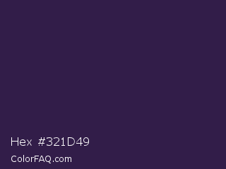 Hex #321d49 Color is a very dark violet color and the nearest color is Russian Violet #32174d. Hex code #321d49 and RGB value is rgb(50,29,73). In RGB color space, this color is composed of 20% red, 11% green, 29% blue, In CMYK color space, this color is composed of 32% cyan, 60% magenta, 0% yellow , 71% black , In HSL color space, this color has a hue angle of 269° , 43% saturation and 20% lightness.