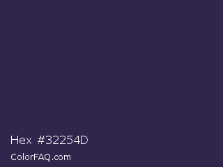 Hex #32254d Color is a very dark indigo color and the nearest color is Martinique #363050. Hex code #32254d and RGB value is rgb(50,37,77). In RGB color space, this color is composed of 20% red, 15% green, 30% blue, In CMYK color space, this color is composed of 35% cyan, 52% magenta, 0% yellow , 70% black , In HSL color space, this color has a hue angle of 260° , 35% saturation and 22% lightness.
