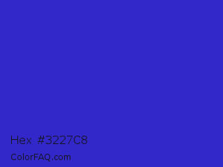 Hex #3227c8 Color is a normal indigo color and the nearest color is Interdimensional Blue #360ccc. Hex code #3227c8 and RGB value is rgb(50,39,200). In RGB color space, this color is composed of 20% red, 15% green, 78% blue, In CMYK color space, this color is composed of 75% cyan, 81% magenta, 0% yellow , 22% black , In HSL color space, this color has a hue angle of 244° , 67% saturation and 47% lightness.