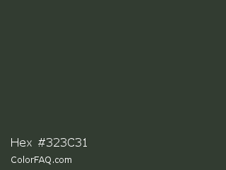 Hex #323c31 Color is a very dark green color and the nearest color is Kombu Green #354230. Hex code #323c31 and RGB value is rgb(50,60,49). In RGB color space, this color is composed of 20% red, 24% green, 19% blue, In CMYK color space, this color is composed of 17% cyan, 0% magenta, 18% yellow , 76% black , In HSL color space, this color has a hue angle of 115° , 10% saturation and 21% lightness.