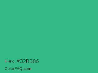 Hex #32bb86 Color is a normal green color and the nearest color is Mountain Meadow #30ba8f. Hex code #32bb86 and RGB value is rgb(50,187,134). In RGB color space, this color is composed of 20% red, 73% green, 53% blue, In CMYK color space, this color is composed of 73% cyan, 0% magenta, 28% yellow , 27% black , In HSL color space, this color has a hue angle of 157° , 58% saturation and 46% lightness.
