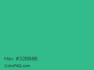 Hex #32bb8b Color is a normal green color and the nearest color is Mountain Meadow #30ba8f. Hex code #32bb8b and RGB value is rgb(50,187,139). In RGB color space, this color is composed of 20% red, 73% green, 55% blue, In CMYK color space, this color is composed of 73% cyan, 0% magenta, 26% yellow , 27% black , In HSL color space, this color has a hue angle of 159° , 58% saturation and 46% lightness.
