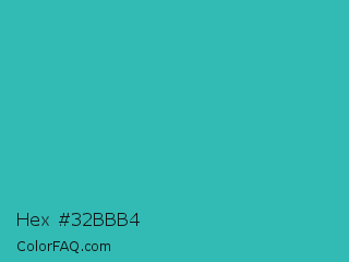 Hex #32bbb4 Color is a normal cyan color and the nearest color is Maximum Blue Green #30bfbf. Hex code #32bbb4 and RGB value is rgb(50,187,180). In RGB color space, this color is composed of 20% red, 73% green, 71% blue, In CMYK color space, this color is composed of 73% cyan, 0% magenta, 4% yellow , 27% black , In HSL color space, this color has a hue angle of 177° , 58% saturation and 46% lightness.