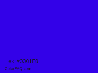Hex #3301e8 Color is a normal indigo color and the nearest color is Electric Ultramarine #3f00ff. Hex code #3301e8 and RGB value is rgb(51,1,232). In RGB color space, this color is composed of 20% red, 0% green, 91% blue, In CMYK color space, this color is composed of 78% cyan, 100% magenta, 0% yellow , 9% black , In HSL color space, this color has a hue angle of 253° , 99% saturation and 46% lightness.