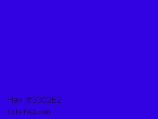 Hex #3302e2 Color is a normal indigo color and the nearest color is Interdimensional Blue #360ccc. Hex code #3302e2 and RGB value is rgb(51,2,226). In RGB color space, this color is composed of 20% red, 1% green, 89% blue, In CMYK color space, this color is composed of 77% cyan, 99% magenta, 0% yellow , 11% black , In HSL color space, this color has a hue angle of 253° , 98% saturation and 45% lightness.