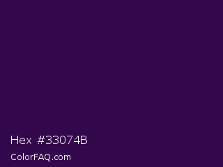 Hex #33074b Color is a very dark purple color and the nearest color is Valentino #350e42. Hex code #33074b and RGB value is rgb(51,7,75). In RGB color space, this color is composed of 20% red, 3% green, 29% blue, In CMYK color space, this color is composed of 32% cyan, 91% magenta, 0% yellow , 71% black , In HSL color space, this color has a hue angle of 279° , 83% saturation and 16% lightness.