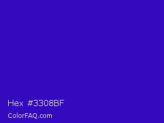 Hex #3308bf Color is a normal indigo color and the nearest color is Interdimensional Blue #360ccc. Hex code #3308bf and RGB value is rgb(51,8,191). In RGB color space, this color is composed of 20% red, 3% green, 75% blue, In CMYK color space, this color is composed of 73% cyan, 96% magenta, 0% yellow , 25% black , In HSL color space, this color has a hue angle of 254° , 92% saturation and 39% lightness.