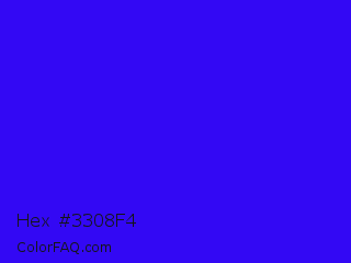 Hex #3308f4 Color is a normal indigo color and the nearest color is Electric Ultramarine #3f00ff. Hex code #3308f4 and RGB value is rgb(51,8,244). In RGB color space, this color is composed of 20% red, 3% green, 96% blue, In CMYK color space, this color is composed of 79% cyan, 97% magenta, 0% yellow , 4% black , In HSL color space, this color has a hue angle of 251° , 94% saturation and 49% lightness.