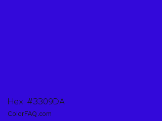 Hex #3309da Color is a normal indigo color and the nearest color is Interdimensional Blue #360ccc. Hex code #3309da and RGB value is rgb(51,9,218). In RGB color space, this color is composed of 20% red, 4% green, 85% blue, In CMYK color space, this color is composed of 77% cyan, 96% magenta, 0% yellow , 15% black , In HSL color space, this color has a hue angle of 252° , 92% saturation and 45% lightness.