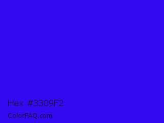 Hex #3309f2 Color is a normal indigo color and the nearest color is Electric Ultramarine #3f00ff. Hex code #3309f2 and RGB value is rgb(51,9,242). In RGB color space, this color is composed of 20% red, 4% green, 95% blue, In CMYK color space, this color is composed of 79% cyan, 96% magenta, 0% yellow , 5% black , In HSL color space, this color has a hue angle of 251° , 93% saturation and 49% lightness.