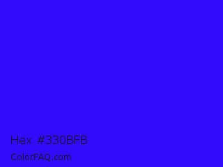 Hex #330bfb Color is a normal indigo color and the nearest color is Electric Ultramarine #3f00ff. Hex code #330bfb and RGB value is rgb(51,11,251). In RGB color space, this color is composed of 20% red, 4% green, 98% blue, In CMYK color space, this color is composed of 80% cyan, 96% magenta, 0% yellow , 2% black , In HSL color space, this color has a hue angle of 250° , 97% saturation and 51% lightness.