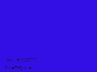 Hex #330fe6 Color is a normal indigo color and the nearest color is Interdimensional Blue #360ccc. Hex code #330fe6 and RGB value is rgb(51,15,230). In RGB color space, this color is composed of 20% red, 6% green, 90% blue, In CMYK color space, this color is composed of 78% cyan, 93% magenta, 0% yellow , 10% black , In HSL color space, this color has a hue angle of 250° , 88% saturation and 48% lightness.