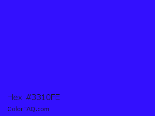 Hex #3310fe Color is a normal indigo color and the nearest color is Electric Ultramarine #3f00ff. Hex code #3310fe and RGB value is rgb(51,16,254). In RGB color space, this color is composed of 20% red, 6% green, 100% blue, In CMYK color space, this color is composed of 80% cyan, 94% magenta, 0% yellow , 0% black , In HSL color space, this color has a hue angle of 249° , 99% saturation and 53% lightness.