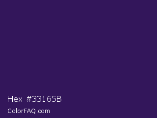 Hex #33165b Color is a very dark violet color and the nearest color is Jagger #350e57. Hex code #33165b and RGB value is rgb(51,22,91). In RGB color space, this color is composed of 20% red, 9% green, 36% blue, In CMYK color space, this color is composed of 44% cyan, 76% magenta, 0% yellow , 64% black , In HSL color space, this color has a hue angle of 265° , 61% saturation and 22% lightness.
