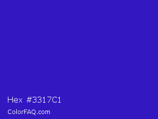 Hex #3317c1 Color is a normal indigo color and the nearest color is Interdimensional Blue #360ccc. Hex code #3317c1 and RGB value is rgb(51,23,193). In RGB color space, this color is composed of 20% red, 9% green, 76% blue, In CMYK color space, this color is composed of 74% cyan, 88% magenta, 0% yellow , 24% black , In HSL color space, this color has a hue angle of 250° , 79% saturation and 42% lightness.