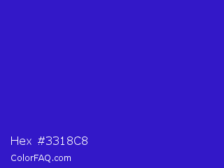 Hex #3318c8 Color is a normal indigo color and the nearest color is Interdimensional Blue #360ccc. Hex code #3318c8 and RGB value is rgb(51,24,200). In RGB color space, this color is composed of 20% red, 9% green, 78% blue, In CMYK color space, this color is composed of 75% cyan, 88% magenta, 0% yellow , 22% black , In HSL color space, this color has a hue angle of 249° , 79% saturation and 44% lightness.
