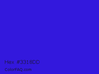 Hex #3318dd Color is a normal indigo color and the nearest color is Interdimensional Blue #360ccc. Hex code #3318dd and RGB value is rgb(51,24,221). In RGB color space, this color is composed of 20% red, 9% green, 87% blue, In CMYK color space, this color is composed of 77% cyan, 89% magenta, 0% yellow , 13% black , In HSL color space, this color has a hue angle of 248° , 80% saturation and 48% lightness.